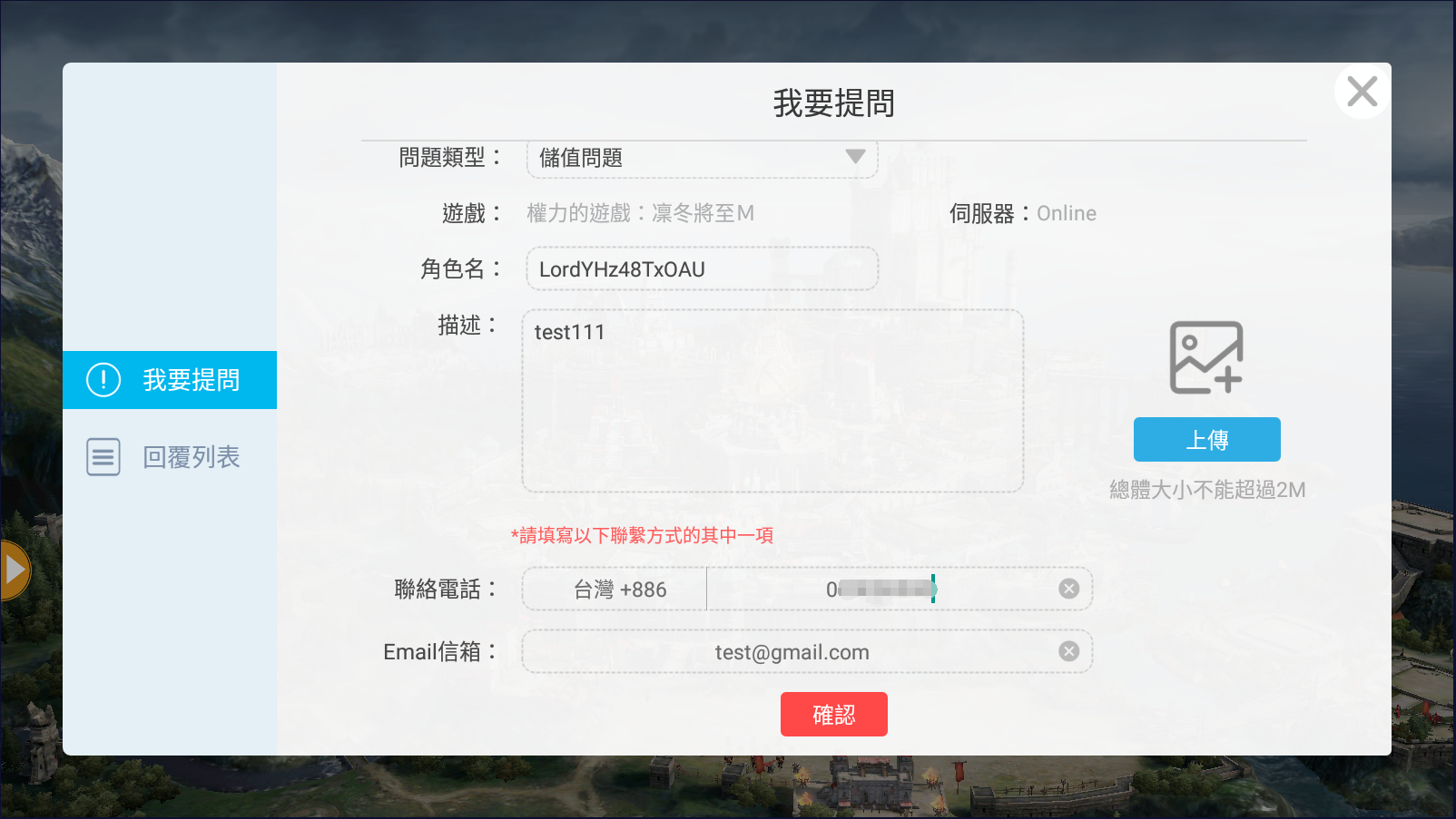 4.相關資料及問題輸入完後,點擊下方【確認】送出
