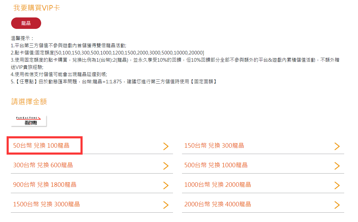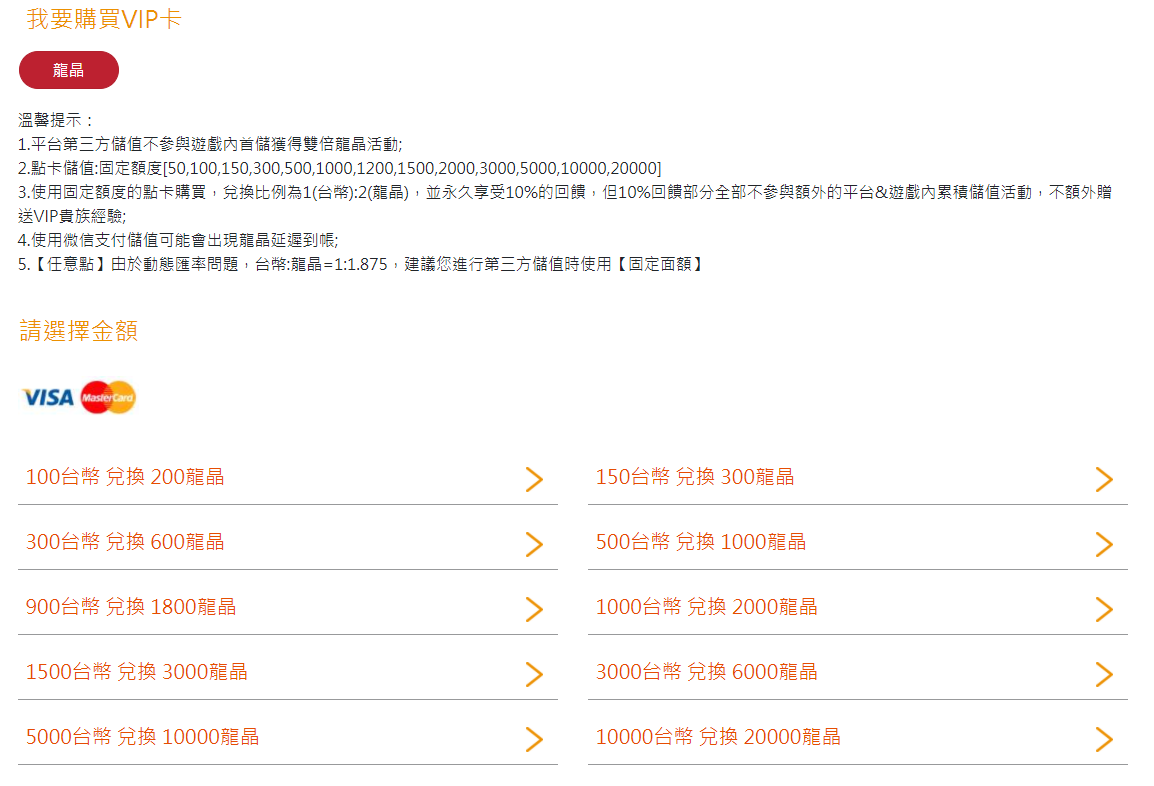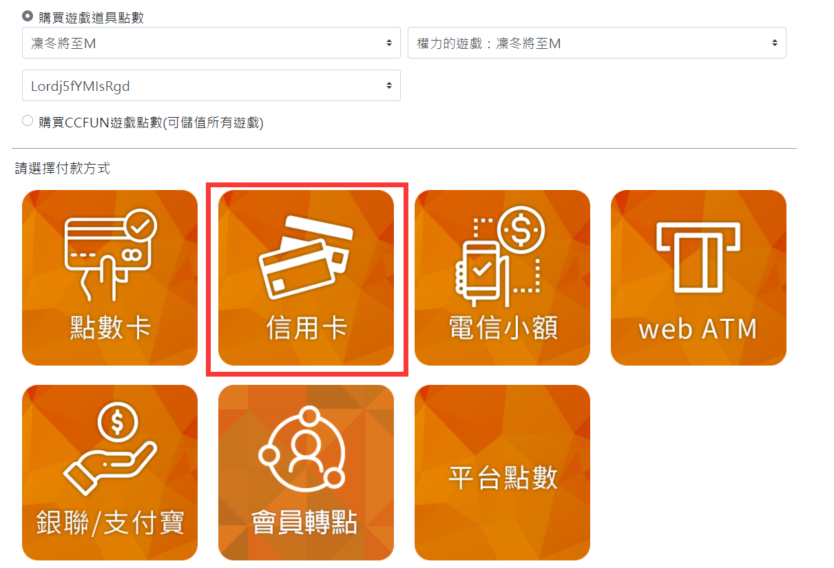 注意:此頁面上方可選擇進行儲值點券額度。
