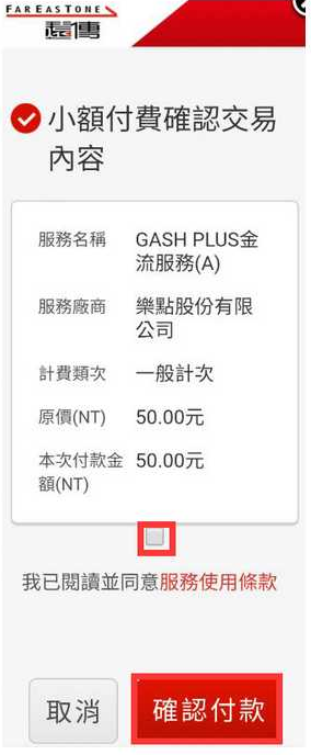 Step 9:確認小額付費交易內容後,勾選同意服務使用條款,並點選確認付款。