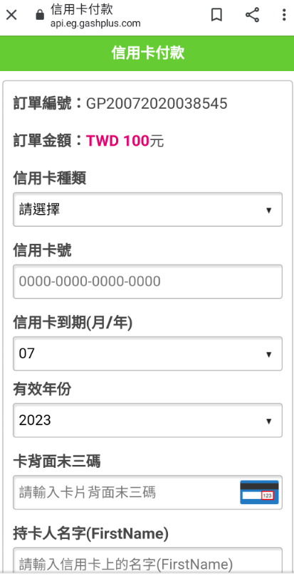 Step 3:選擇具體的信用卡支付方式。(此處以Gash信用卡為例)