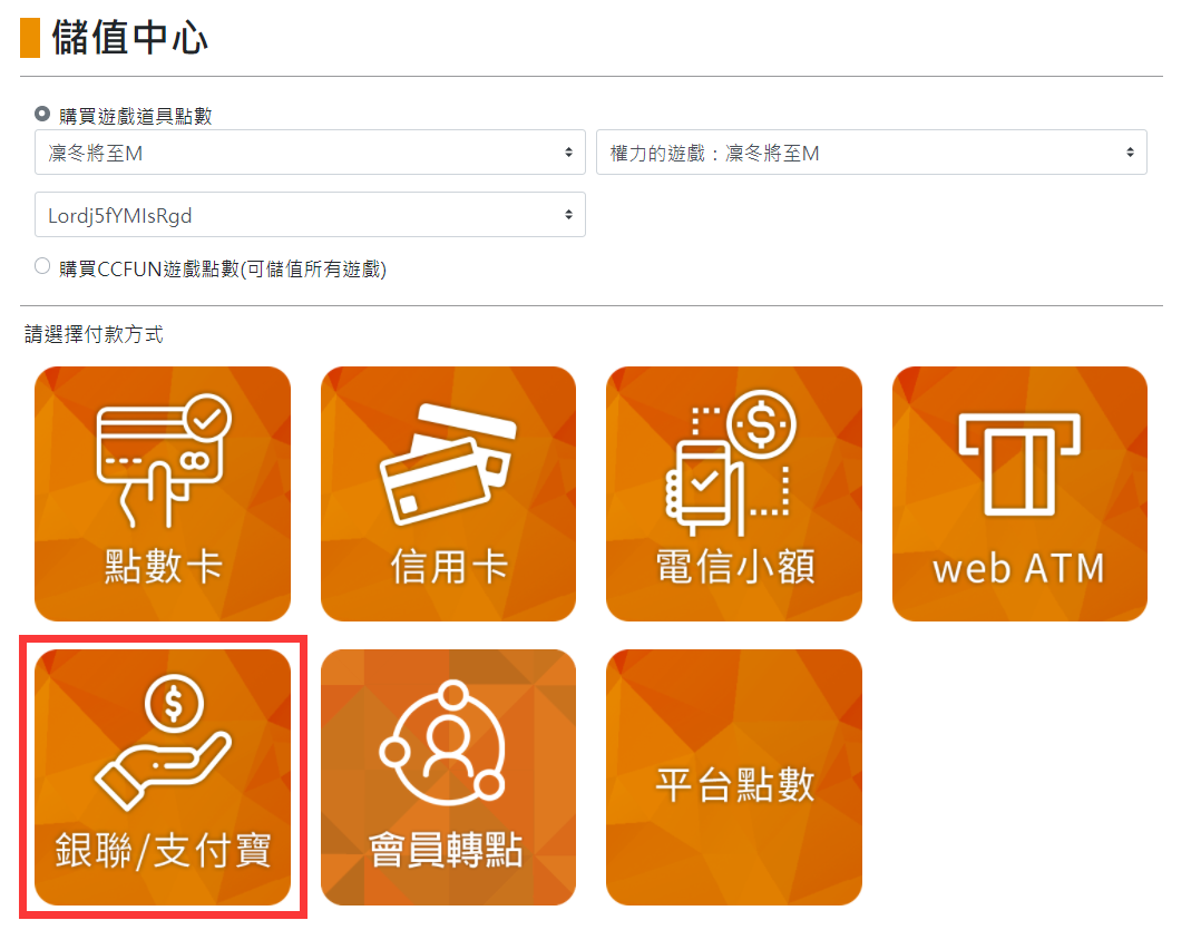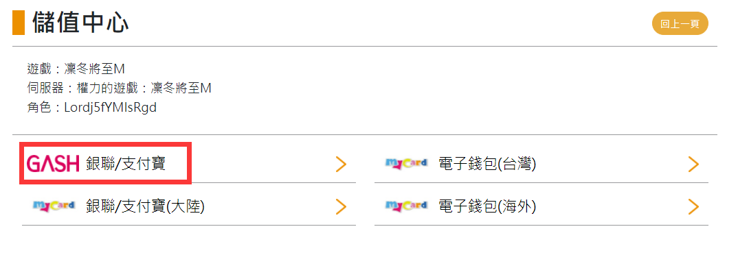 Step 2:選擇想使用的儲值管道。(此處以Gash銀聯/支付寶為例)