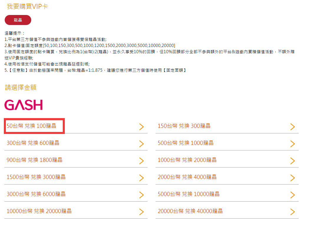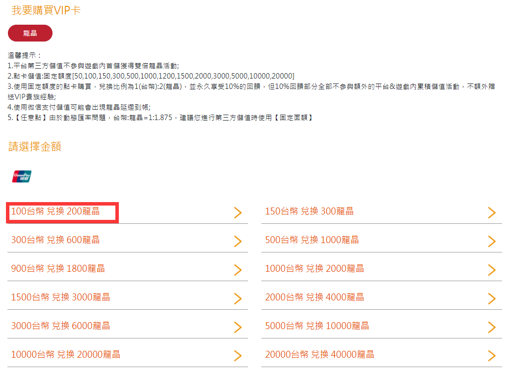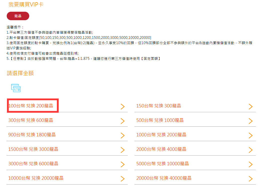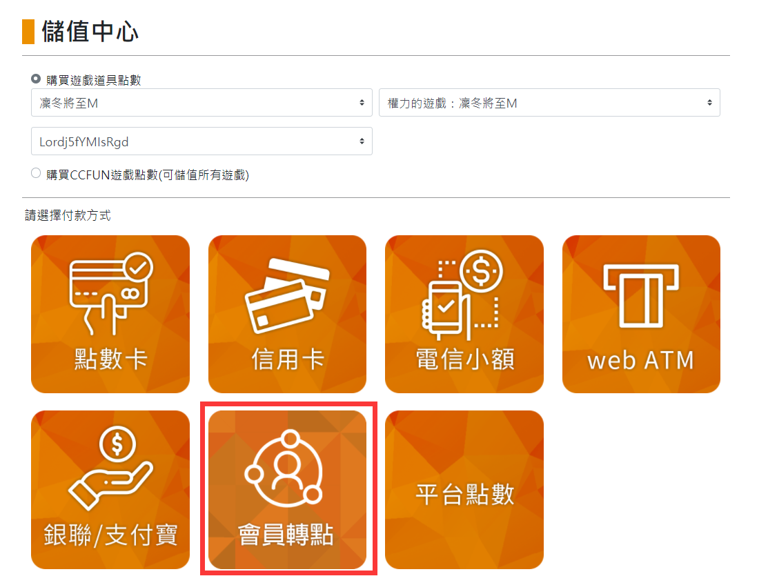 注意:此頁面上方可選擇進行儲值點券額度。