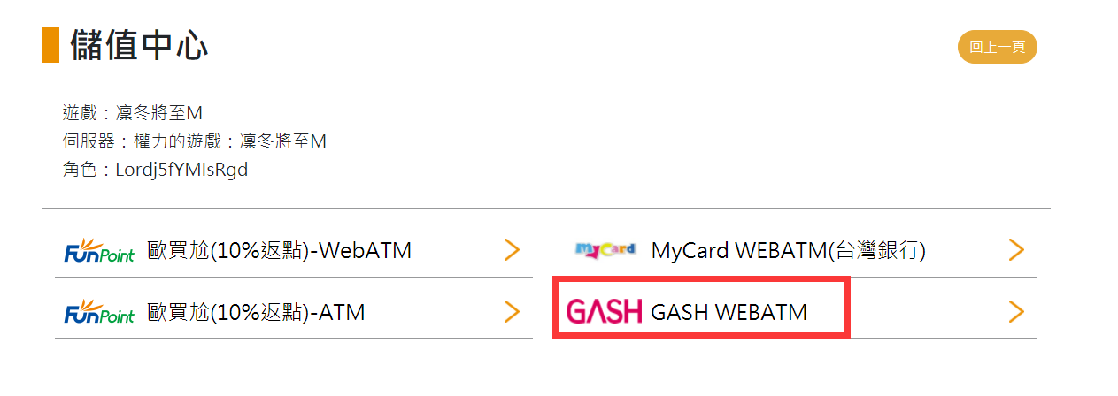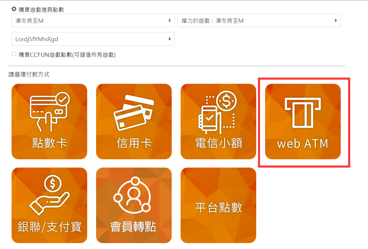 Step 2:選擇儲值管道。(此處以Gash WEBATM為例)